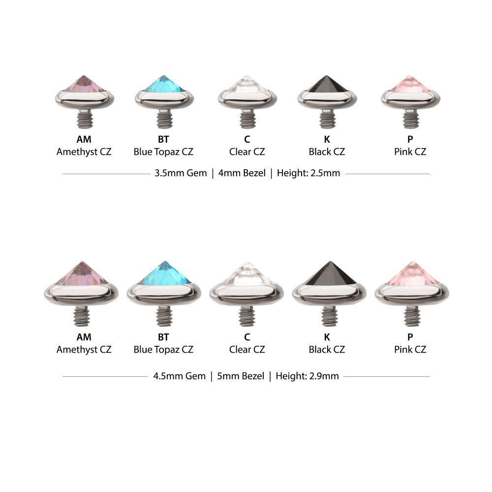 14g Titanium Internally Threaded Round Bezel Set Inverse Gem Top. Manufactured from High Polish Implant Grade Titanium (Ti-6AL-4V-ELI ASTM F136).
