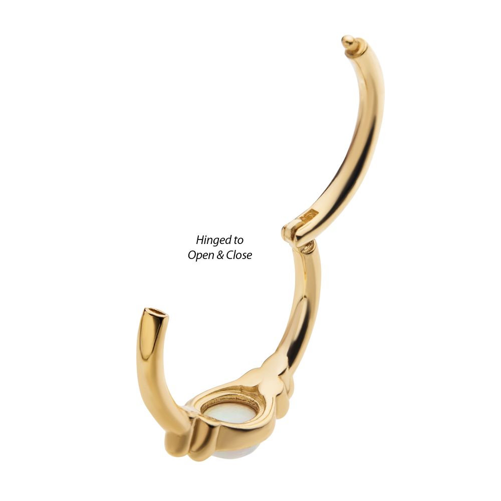 14Kt Gold Beads & Centerpiece Bezel Set White Opal Side Facing Hinged Segment Clicker. The Hinged Segment Clicker offers an easy-to-use design with a minimal seam for an aesthetic that's similar to a segment ring without the stress of dealing with a segment that can get lost. The Hinged Segment Clicker is characterized by the hinged prong that snaps into place with a satisfying click. Perfect for Helix, Septum, and Cartilage. Made of solid 14kt nickel-free Gold.