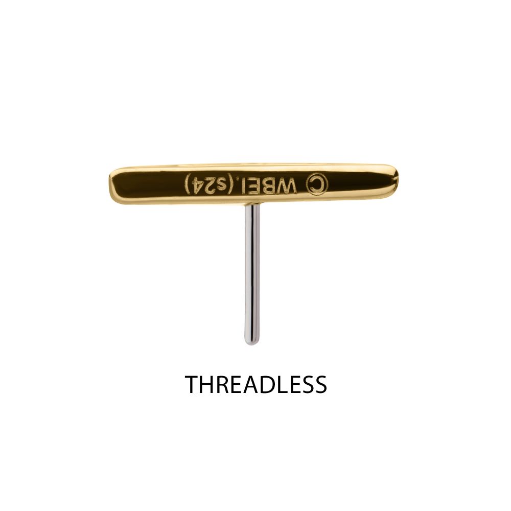 14Kt Gold Harry Potter Deathly Hallows Threadless Top. Made of solid 14kt nickel-free Gold with durable 316LVM ASTM F-138 Implant Grade Steel Pin designed to be practical and easy to use. Fits all sizes of pins and bases in our threadless body jewelry line. Pin Size: 0.45mm x 4.7mm.