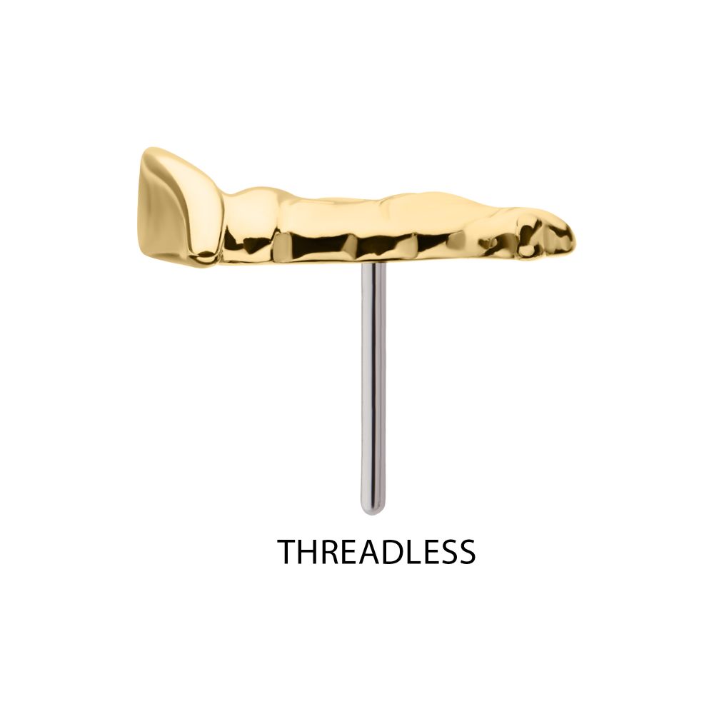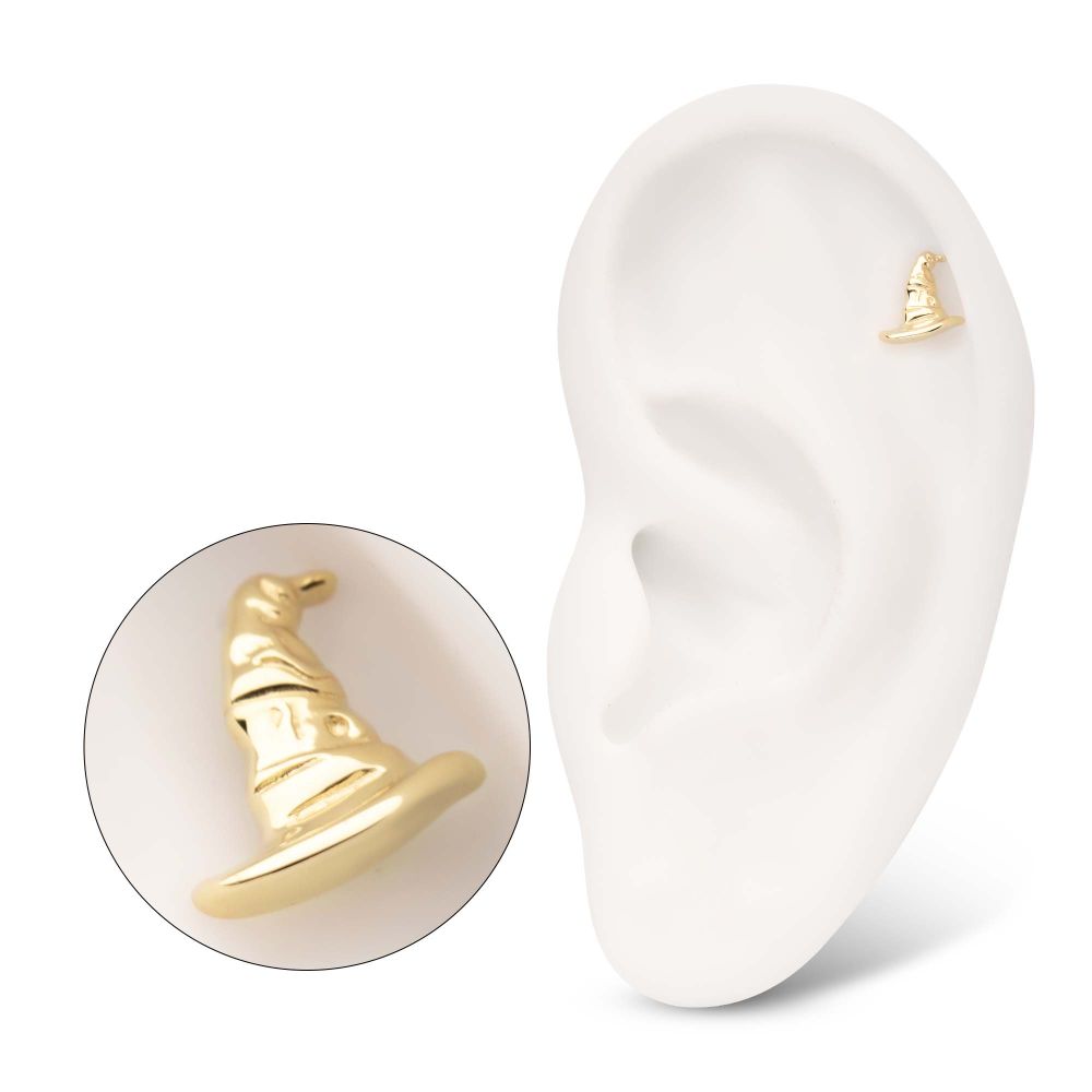 14Kt Gold Harry Potter Sorting Hat Threadless Top. Made of solid 14kt nickel-free Gold with durable 316LVM ASTM F-138 Implant Grade Steel Pin designed to be practical and easy to use. Fits all sizes of pins and bases in our threadless body jewelry line. Pin Size: 0.45mm x 4.7mm.