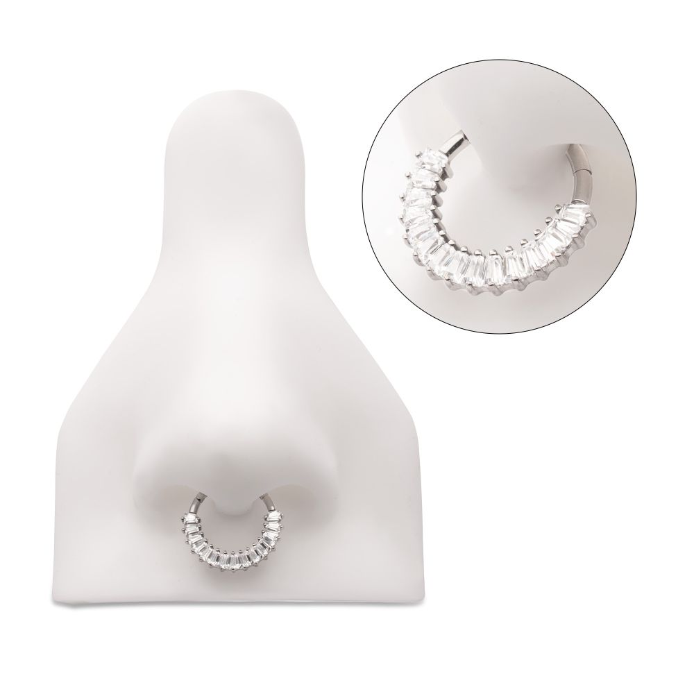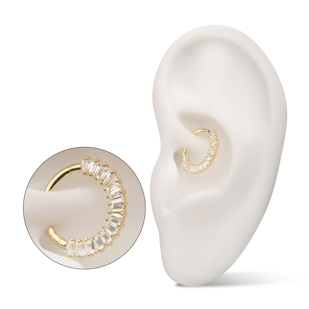 14kt Gold Prong Set Baguette Gem Cluster Front Facing Hinged Segment Clicker. The Hinged Segment Clicker offers an easy-to-use design with a minimal seam for an aesthetic that's similar to a segment ring without the stress of dealing with a segment that can get lost. The Hinged Segment Clicker is characterized by the hinged prong that snaps into place with a satisfying click. Perfect for Helix, Septum and Cartilage. Made of solid 14kt nickel-free Gold.