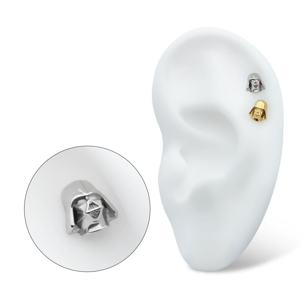 14Kt Gold Star Wars Darth Vader Threadless Top is made of solid 14kt nickel-free Gold with 25g durable 316LVM ASTM F-138 Implant Grade Steel Pin designed to be practical and easy to use. Fits all sizes of pins and bases in our threadless body jewelry line. Pin Size: 0.45mm x 4.7mm.