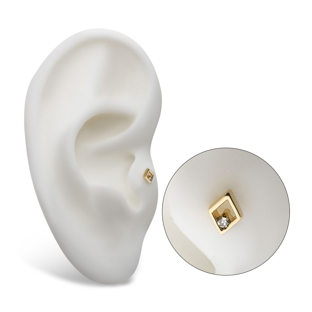 14Kt Gold Threadless Cut Out Rhombus Shape Top with Prong Set Round Lab-Grown Rhombus. Made of solid 14kt nickel-free Gold with durable 316LVM ASTM F-138 Implant Grade Steel Pin designed to be practical and easy to use. Fits all sizes of pins and bases in our threadless body jewelry line. Pin Size: 0.45mm x 4.7mm.