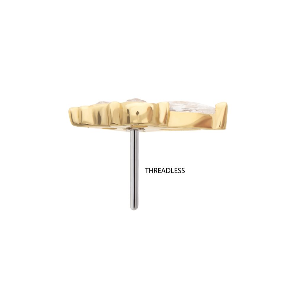 14Kt Gold Threadless Prong Set Marquise & Triple Round Gem Top. Made of solid 14kt nickel-free Gold with durable 316LVM ASTM F-138 Implant Grade Steel Pin designed to be practical and easy to use. Fits all sizes of pins and bases in our threadless body jewelry line. Pin Size: 0.45mm x 4.7mm.