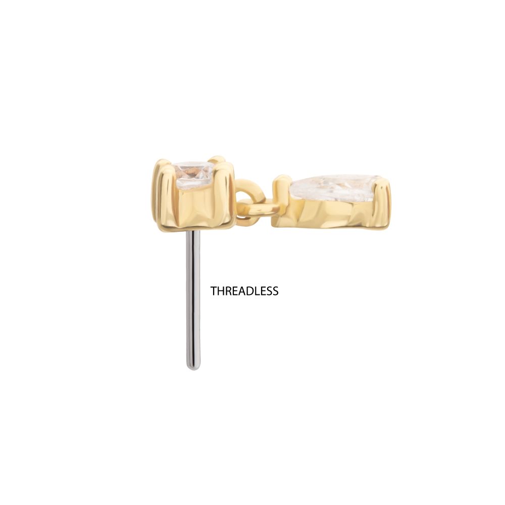 14Kt Gold Threadless Prong Set Round Gem Top with Teardrop Dangle. Made of solid 14kt nickel-free Gold with durable 316LVM ASTM F-138 Implant Grade Steel Pin designed to be practical and easy to use. Fits all sizes of pins and bases in our threadless body jewelry line. Pin Size: 0.45mm x 4.7mm.