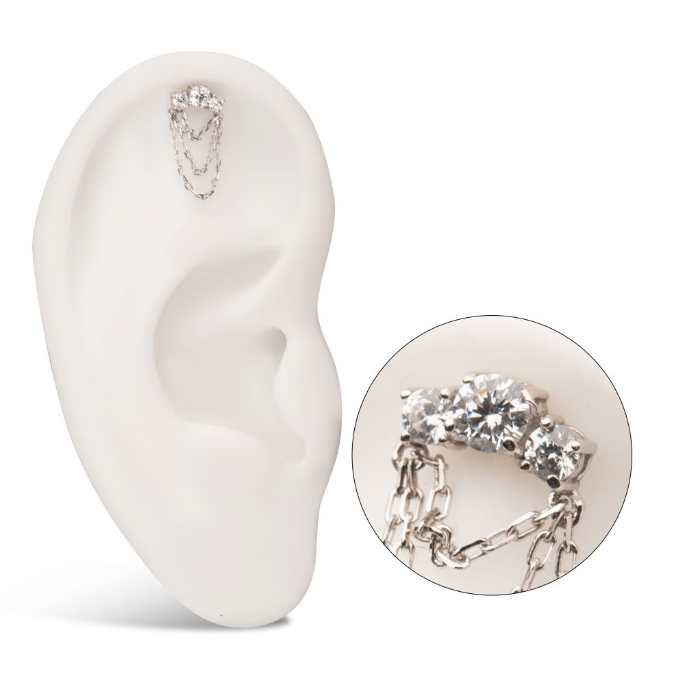 14Kt Gold Threadless Threadless 3-Cluster Prong Set Gem Top with 3-Tier Chain Dangle is made of solid 14kt nickel-free Gold with durable 316LVM ASTM F-138 Implant Grade Steel Pin designed to be practical and easy to use. Fits all sizes of pins and bases in our threadless body jewelry line. Pin Size: 0.45mm x 4.7mm.; Chain sizes: 25mm; 18mm; 12mm