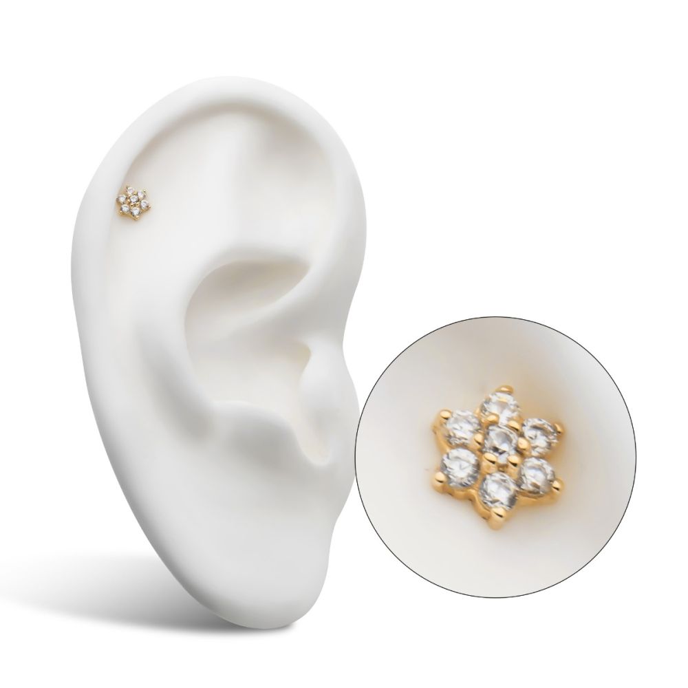 14Kt Yellow Gold Threadless with 6 Prong Set Clear CZ and Centerpiece CZ/Synthetic Opal Flower Top is made of solid 14kt nickel-free Gold with durable 316LVM ASTM F-138 Implant Grade Steel Pin designed to be practical and easy to use. Fits all sizes of pins and bases in our threadless body jewelry line. Pin Size: 0.45mm x 4.7mm.