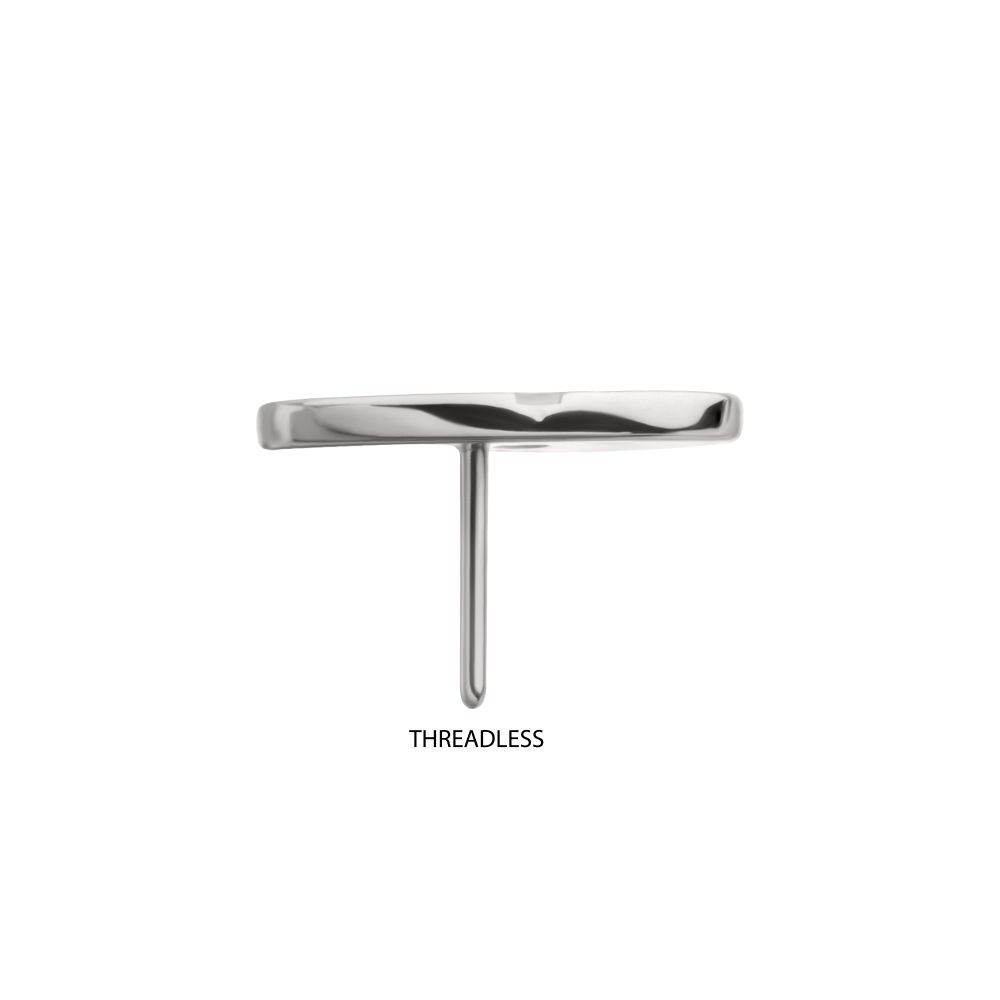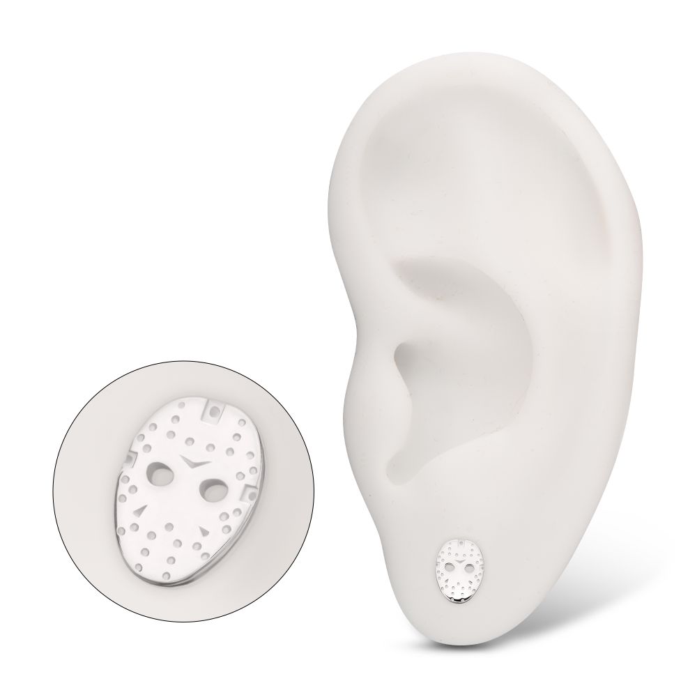 14Kt White Gold Friday The 13th Jason Mask Threadless Top. Made of solid 14kt nickel-free Gold with durable 316LVM ASTM F-138 Implant Grade Steel Pin designed to be practical and easy to use. Fits all sizes of pins and bases in our threadless body jewelry line. Pin Size: 0.45mm x 4.7mm.