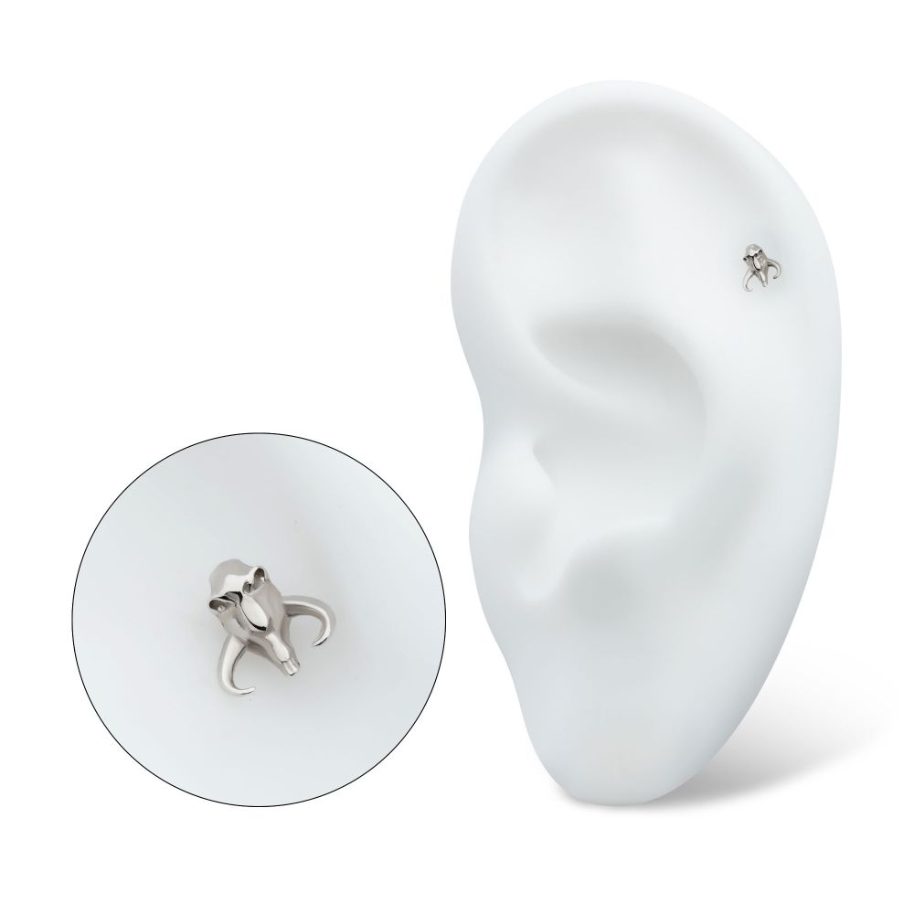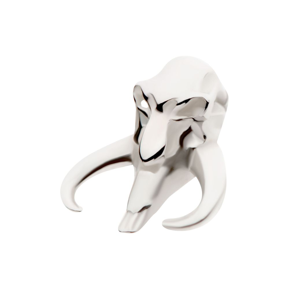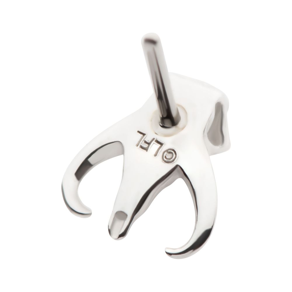 14Kt White Gold Star Wars The Mandalorian Mythosaur Threadless Top is made of solid 14kt nickel-free Gold with 25g durable 316LVM ASTM F-138 Implant Grade Steel Pin designed to be practical and easy to use. Fits all sizes of pins and bases in our threadless body jewelry line. Pin Size: 0.45mm x 4.7mm.