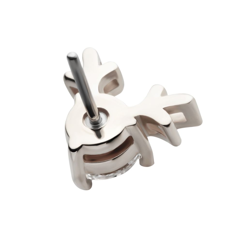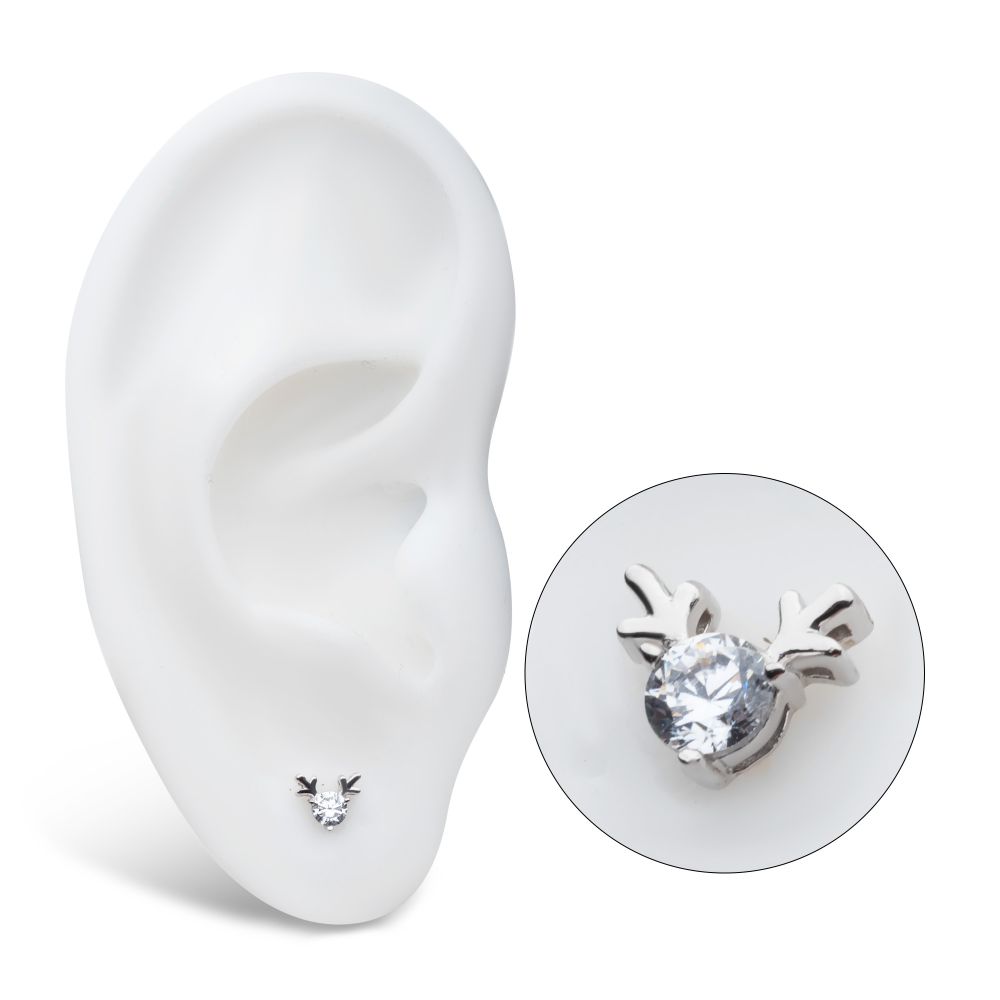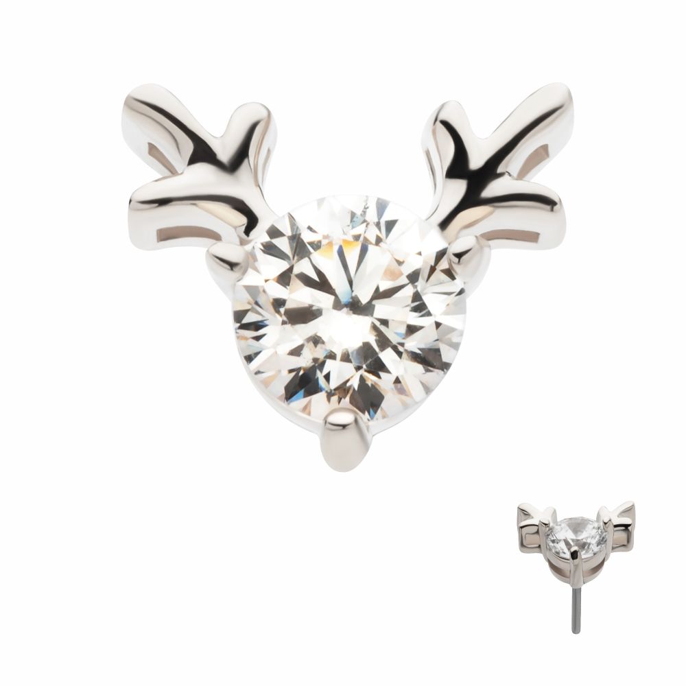 14Kt White Gold Threadless Prong Set 3mm Clear CZ Reindeer Top. Made of solid 14kt nickel-free Gold with durable 316LVM ASTM F-138 Implant Grade Steel Pin designed to be practical and easy to use. Fits all sizes of pins and bases in our threadless body jewelry line. Pin Size: 0.45mm x 4.7mm