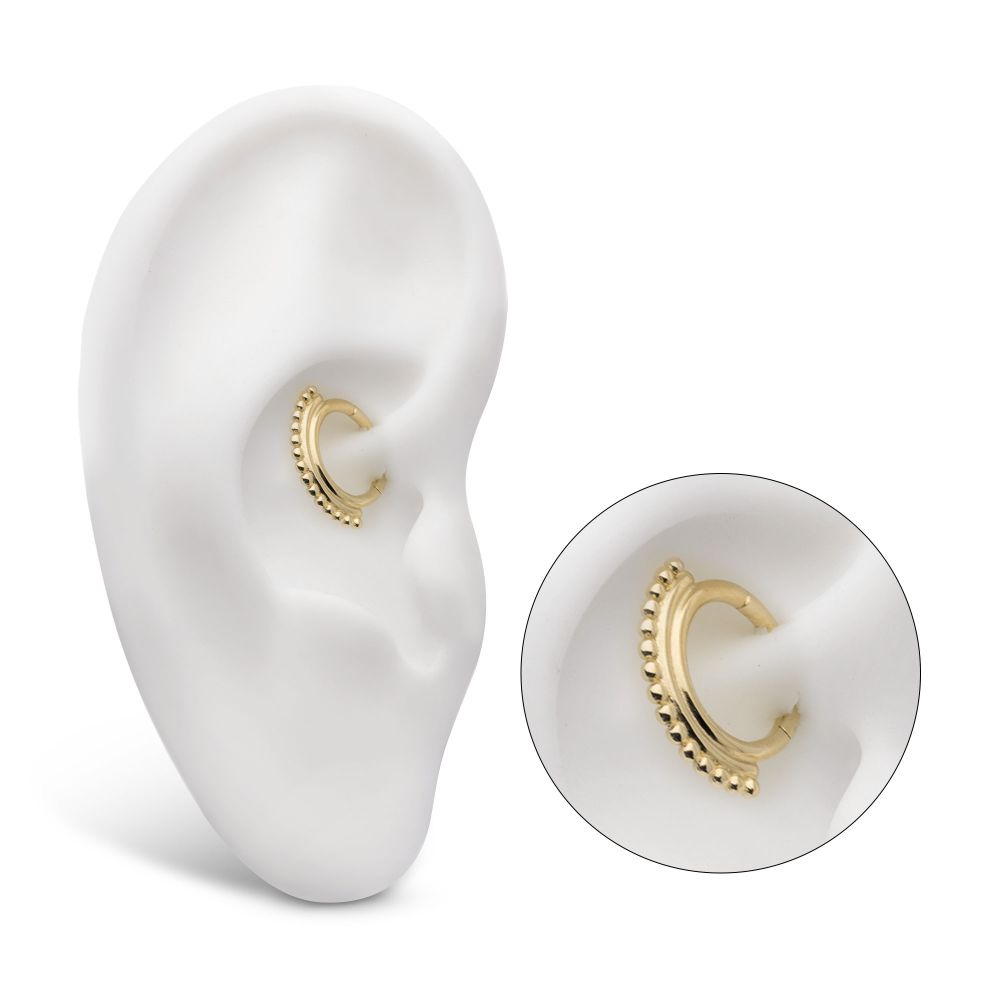14Kt Yellow Gold 15 Bead Cluster Double H₂O₂ Front Facing Hinged Segment Clicker. The Hinged Segment Clicker offers an easy-to-use design with a minimal seam for an aesthetic that's similar to a segment ring without the stress of dealing with a segment that can get lost. The Hinged Segment Clicker is characterized by the hinged prong that snaps into place with a satisfying click. Perfect for Helix, Septum, and Cartilage. Made of solid 14kt nickel-free Gold.