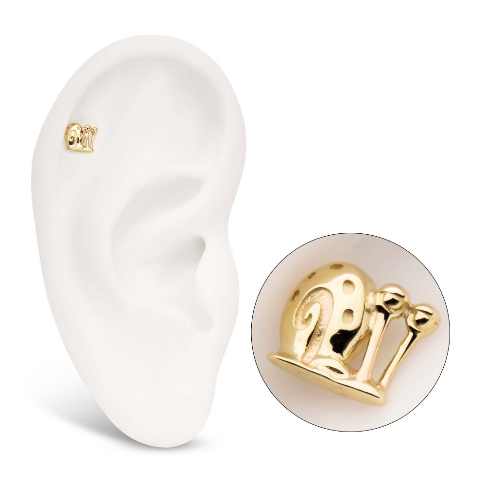 14Kt Yellow Gold Nickelodeon Gary the Snail Threadless Top is made of solid 14kt nickel-free Gold with durable 316LVM ASTM F-138 Implant Grade Steel Pin designed to be practical and easy to use. Fits all sizes of pins and bases in our threadless body jewelry line. Pin Gauge: 25g