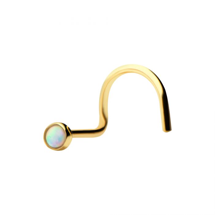 20g 14kt Yellow Gold Nose Screw with 1.75mm Bezel Set Synthetic Opal. Made from solid 14kt nickel-free Gold.