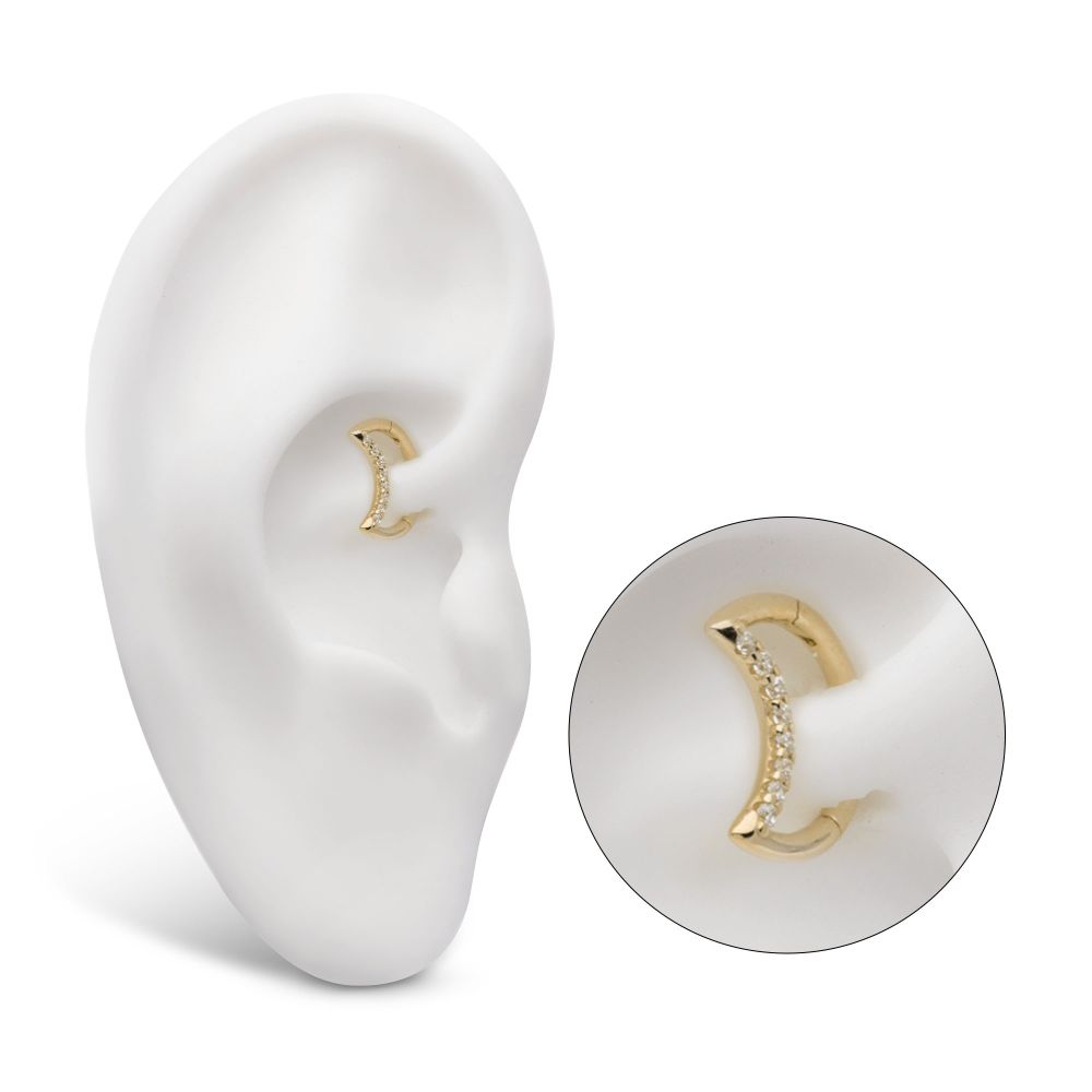 14Kt Yellow Gold Prong Set 8 Round CZ Cluster Crescent Moon Shape Front Facing Hinged Segment Clicker. The Hinged Segment Clicker offers an easy-to-use design with a minimal seam for an aesthetic that's similar to a segment ring without the stress of dealing with a segment that can get lost. The Hinged Segment Clicker is characterized by the hinged prong that snaps into place with a satisfying click. Perfect for Helix, Septum, and Cartilage. Made of solid 14kt nickel-free Gold.
