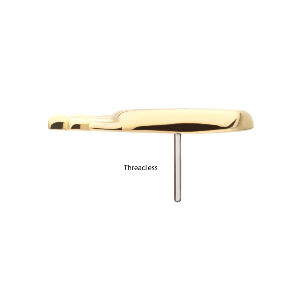 14Kt Yellow Gold Threadless 2D Dripping Crescent Moon Top. 2D crescent moon adorned with drips of gold offers a celestially eerie flair. Made of solid 14kt nickel-free Gold with durable 316LVM ASTM F-138 Implant Grade Steel Pin designed to be practical and easy to use. Fits all sizes of pins and bases in our threadless body jewelry line. Pin Size: 0.45mm x 4.7mm.
