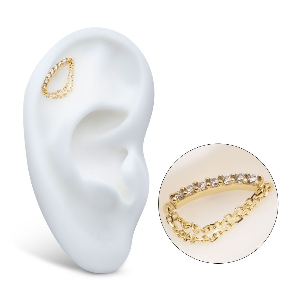 14Kt Yellow Gold Threadless 7 Round Prong Set CZ Curve Bar Top with 2 Tier Dangle Chain. Made of solid 14kt nickel-free Gold with durable 316LVM ASTM F-138 Implant Grade Steel Pin designed to be practical and easy to use. Fits all sizes of pins and bases in our threadless body jewelry line. Pin Size: 0.45mm x 4.7mm. Chains: 9.6mm (L), 6.7mm (L)