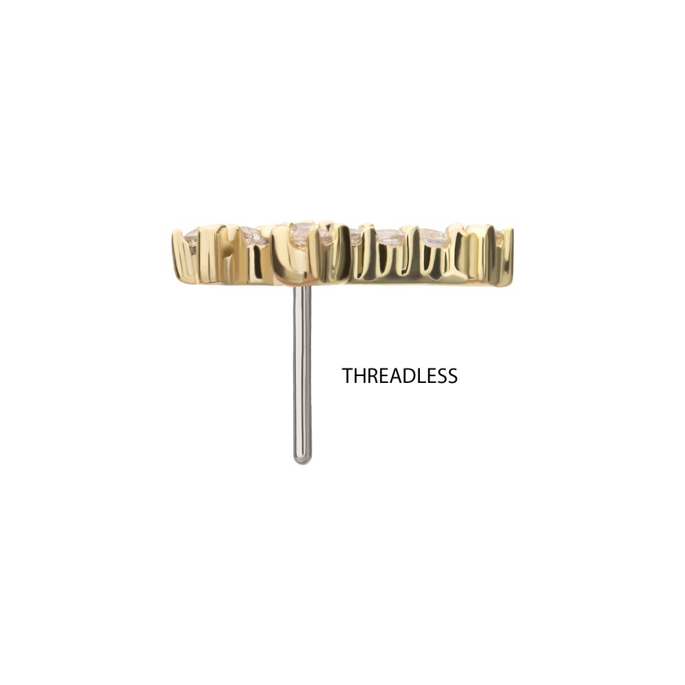 14kt Yellow Gold Threadless Antique Cross Top with Prong Set Gem. Made of solid 14kt nickel-free Gold with durable 316LVM ASTM F-138 Implant Grade Steel Pin designed to be practical and easy to use. Fits all sizes of pins and bases in our threadless body jewelry line. Pin Size: 0.45mm x 4.7mm.