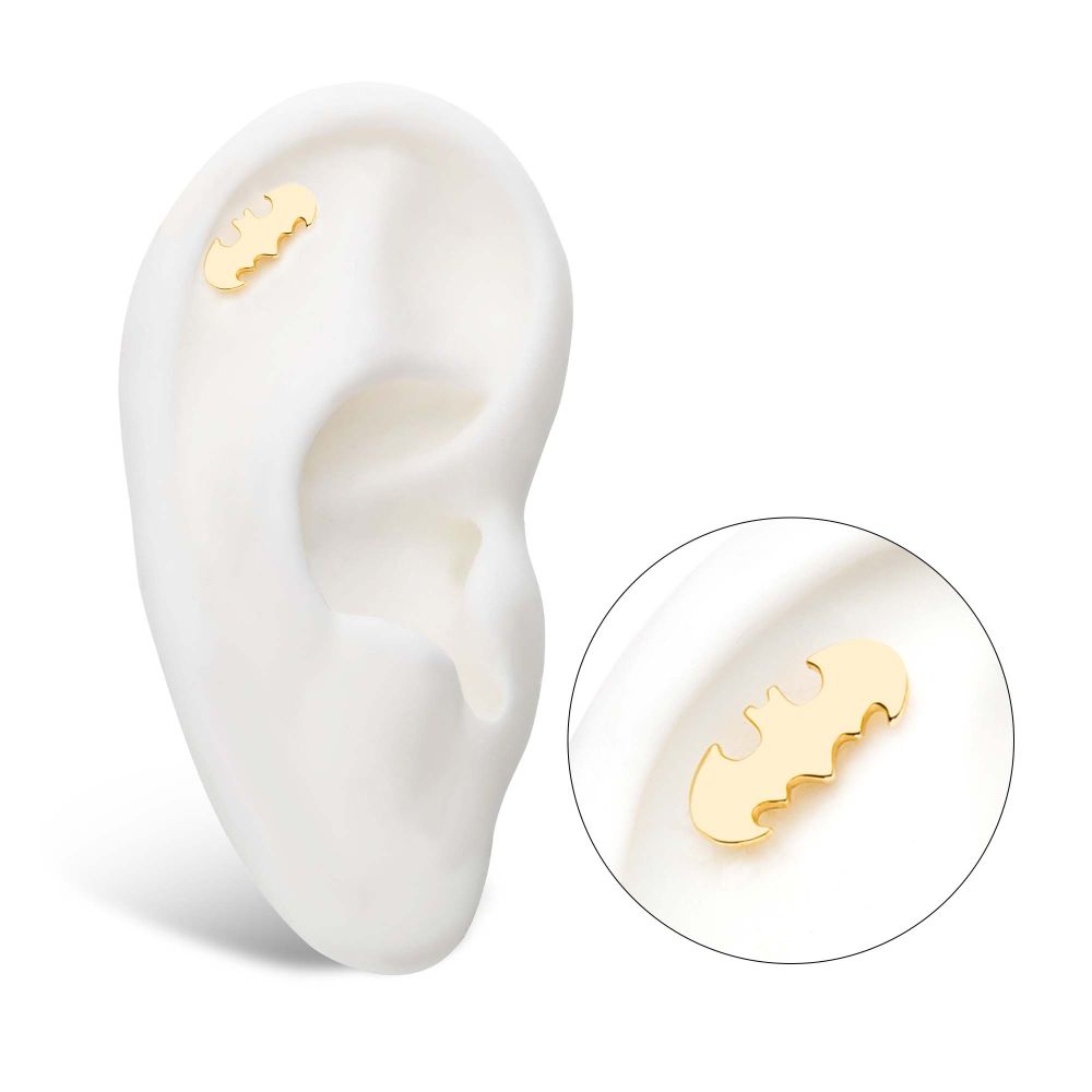 14kt Threadless Batman Logo Top is made of solid 14kt nickel-free Gold with durable 316LVM ASTM F-138 Implant Grade Steel Pin designed to be practical and easy to use. Fits all sizes of pins and bases in our threadless body jewelry line. Pin Gauge: 25g