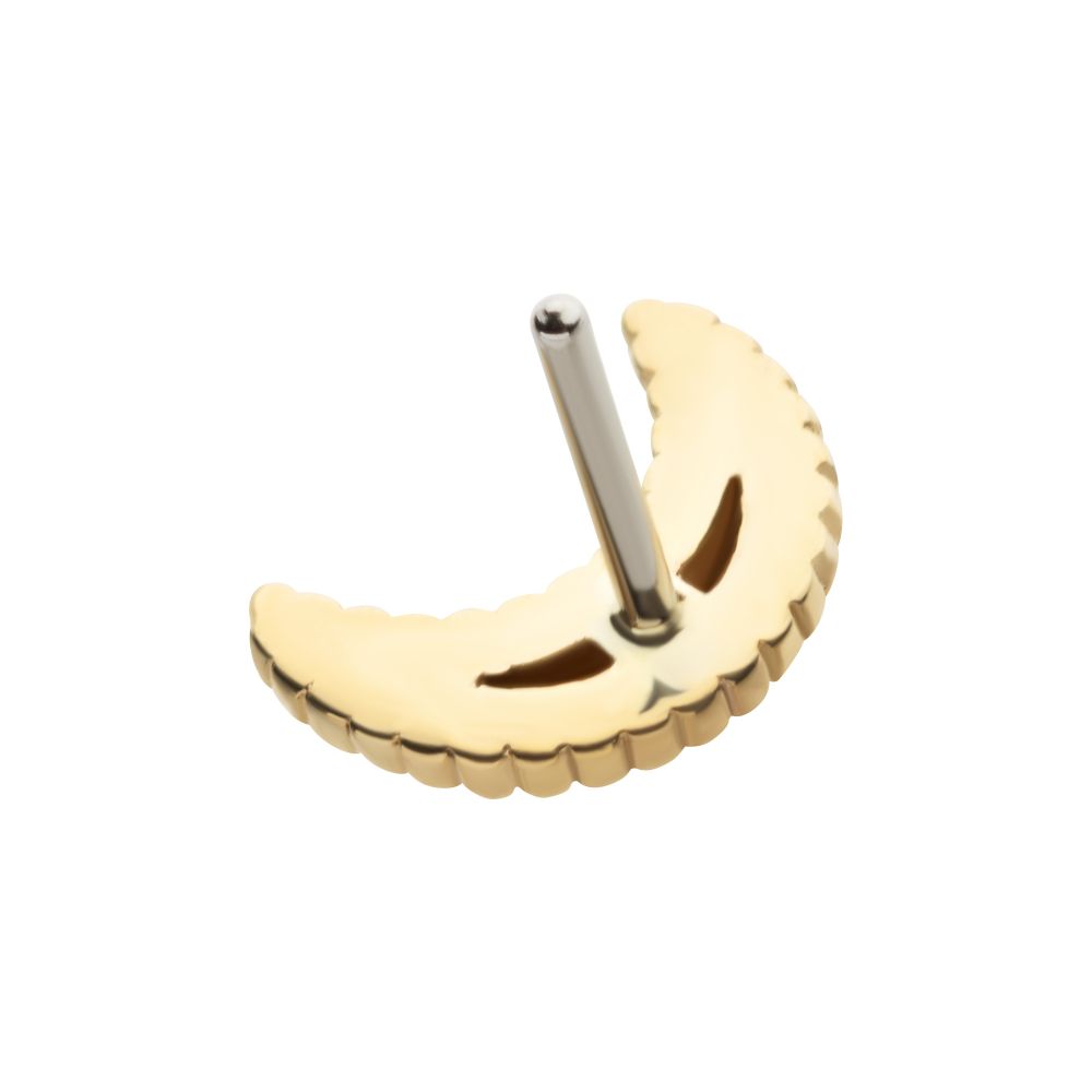 14Kt Yellow Gold Threadless Beaded Edge Crescent Moon Top. Made of solid 14kt nickel-free Gold with durable 316LVM ASTM F-138 Implant Grade Steel Pin designed to be practical and easy to use. Fits all sizes of pins and bases in our threadless body jewelry line. Pin Size: 0.45mm x 4.7mm