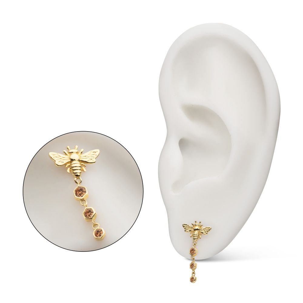 A regal bee motif crowned with cascading bezel-set hexagon shape stones movement of the drop creates subtle shimmer with every turn. The gemstone accents catch the light beautifully, while the slim silhouette ensures comfort and wearability. Works well in lobe, helix, or flat placements.