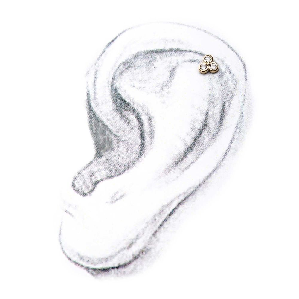 2mm bezel set clear cubic zirconia make this 14k gold threadless trinity top a favorite for its simplicity and style. Compatible with any threadless Invictus bar or base in any gauge. To secure inside bar or base, add a slight bend to the pin by simply inserting the pin halfway and pushing the top to one side.
