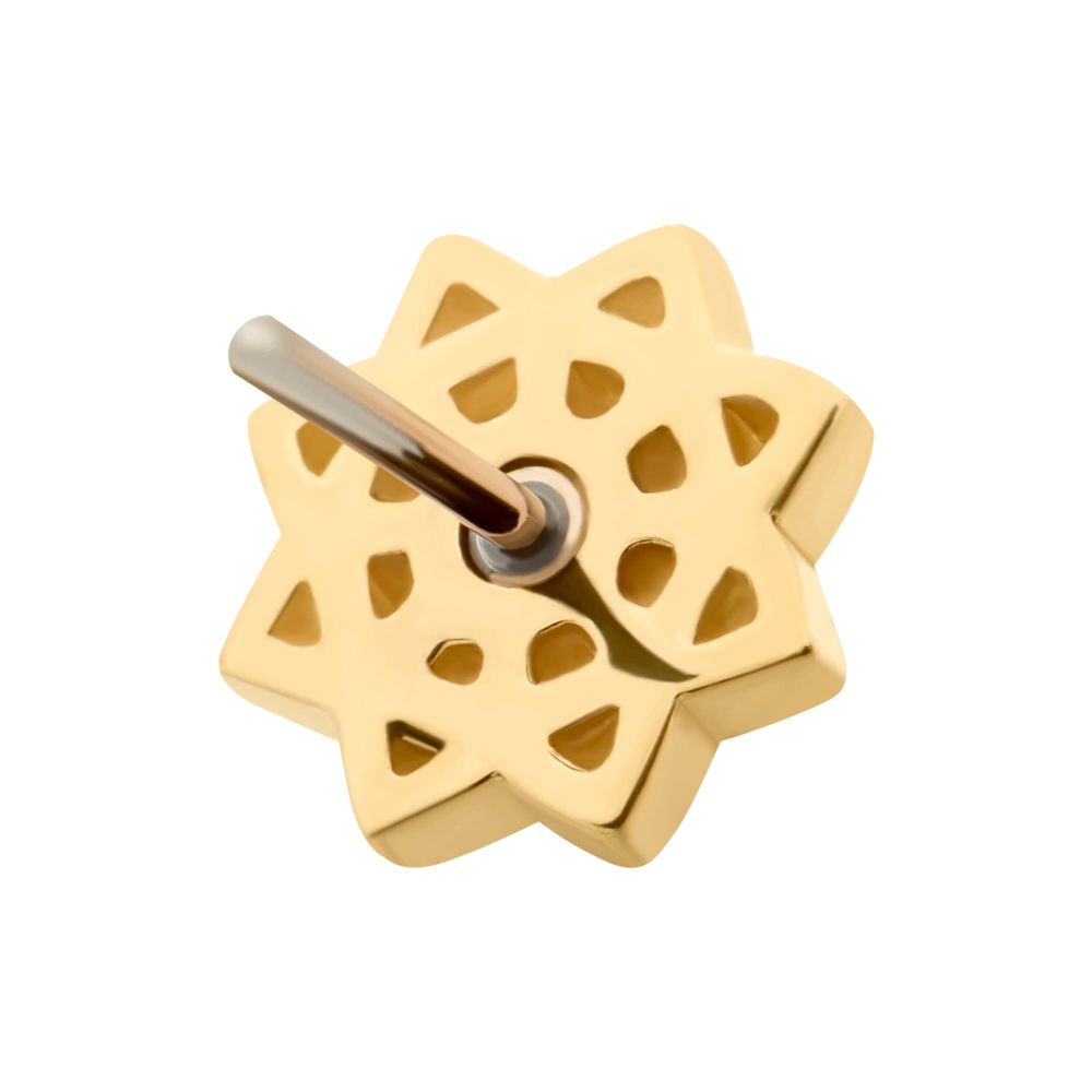 14kt Yellow Gold Threadless Bezel Set Gem/Opal Mandala Flower Top is made of solid 14kt nickel-free Gold with durable 316LVM ASTM F-138 Implant Grade Steel Pin designed to be practical and easy to use. Fits all sizes of pins and bases in our threadless body jewelry line. Pin Size: 0.45mm x 4.7mm.