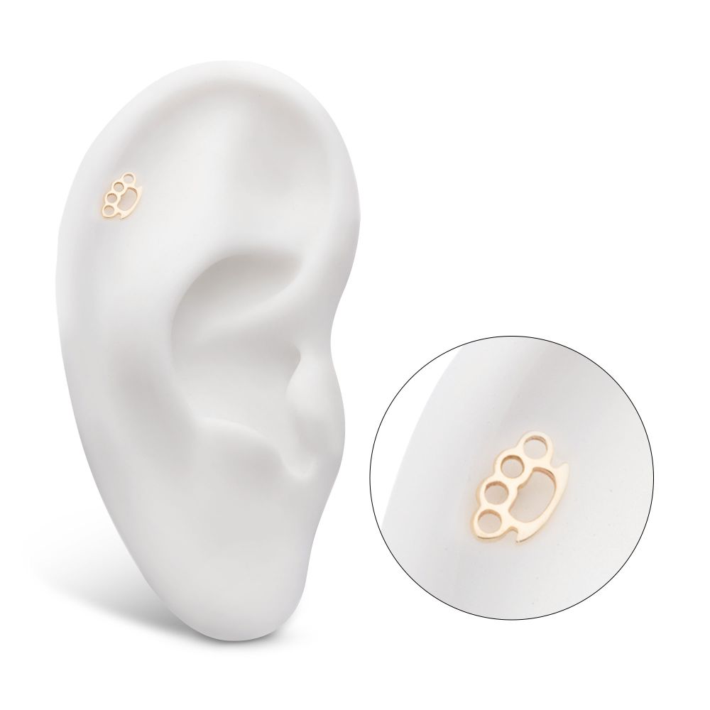 14Kt Yellow Gold Threadless Brass Knuckle Top. Made of solid 14kt nickel-free Gold with durable 316LVM ASTM F-138 Implant Grade Steel Pin designed to be practical and easy to use. Fits all sizes of pins and bases in our threadless body jewelry line. Pin Size: 0.45mm x 4.7mm