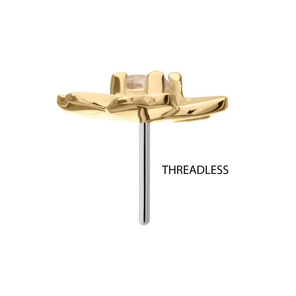 14Kt Yellow Gold Threadless Cherry Blossom Flower Top with Prong Set Gem. Made of solid 14kt nickel-free Gold with durable 316LVM ASTM F-138 Implant Grade Steel Pin designed to be practical and easy to use. Fits all sizes of pins and bases in our threadless body jewelry line. Pin Size: 0.45mm x 4.7mm.