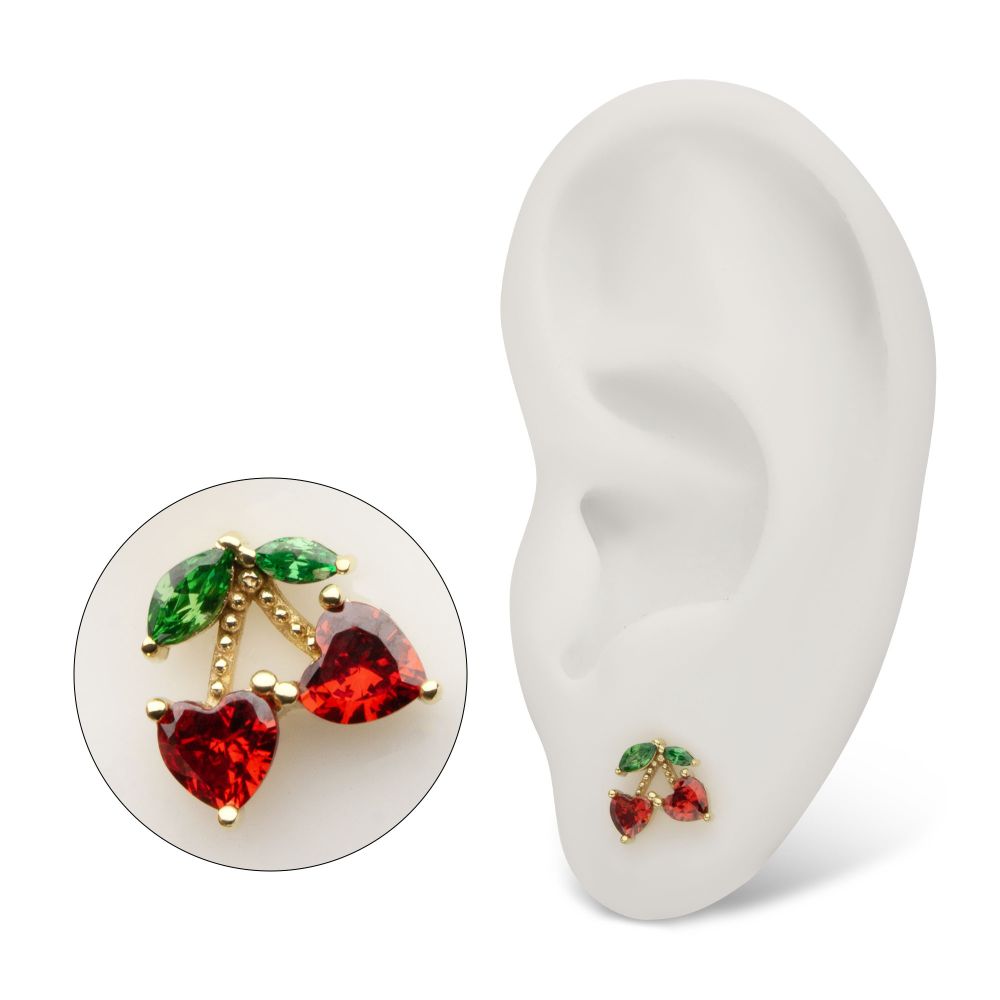 14Kt Yellow Gold Threadless Cherry Heart Leaf Top. Cherry top featuring heart shaped ruby gems bound by 3 prongs and 2 marquise light green gems to compliment this sweet piece. Made of solid 14kt nickel-free Gold with durable 316LVM ASTM F-138 Implant Grade Steel Pin designed to be practical and easy to use. Fits all sizes of pins and bases in our threadless body jewelry line. Pin Size: 0.45mm x 4.7mm.