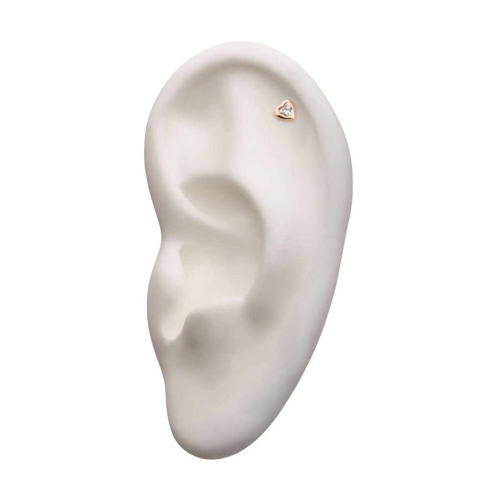 14Kt Yellow Gold Threadless Clear Gem Fancy Heart Top is made of solid 14kt nickel-free Gold with durable 316LVM ASTM F-138 Implant Grade Steel Pin designed to be practical and easy to use. Fits all sizes of pins and bases in our threadless body jewelry line. Gem Size: 3mm; Pin Size: 0.45mm x 4.7mm.