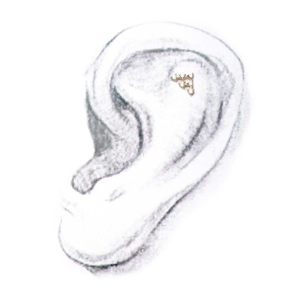Multiple crown-set clear cubic zirconia shape this unique 14k gold threadless top. Part triangle, part constellation, it is a piece that clients will definitely notice on a display or in a case. Compatible with any threadless Invictus bar or base in any gauge. To secure inside bar or base, add a slight bend to the pin by simply inserting the pin halfway and pushing the top to one side.