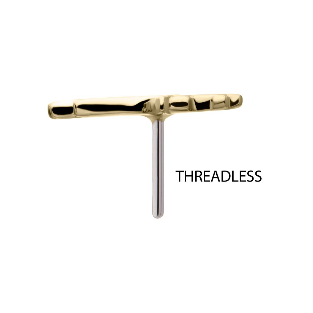 14Kt Yellow Gold Threadless Eastern Dragon Top. Made of solid 14kt nickel-free Gold with durable 316LVM ASTM F-138 Implant Grade Steel Pin designed to be practical and easy to use. Fits all sizes of pins and bases in our threadless body jewelry line. Pin Size: 0.45mm x 4.7mm.