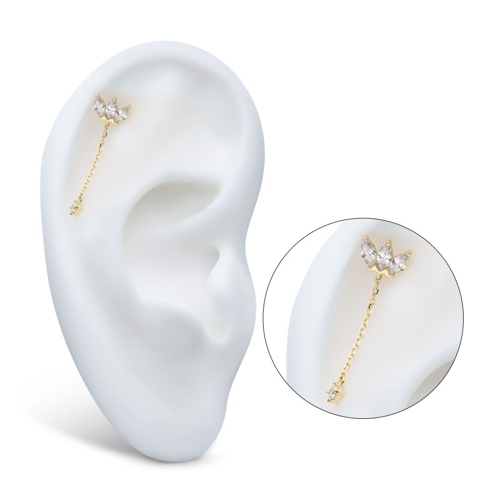 14Kt Yellow Gold Threadless Fan Shape Triple Marquise Gem Top with CZ Chain Dangle. Made of solid 14kt nickel-free Gold with durable 316LVM ASTM F-138 Implant Grade Steel Pin designed to be practical and easy to use. Fits all sizes of pins and bases in our threadless body jewelry line. Pin Size: 0.45mm x 4.7mm.