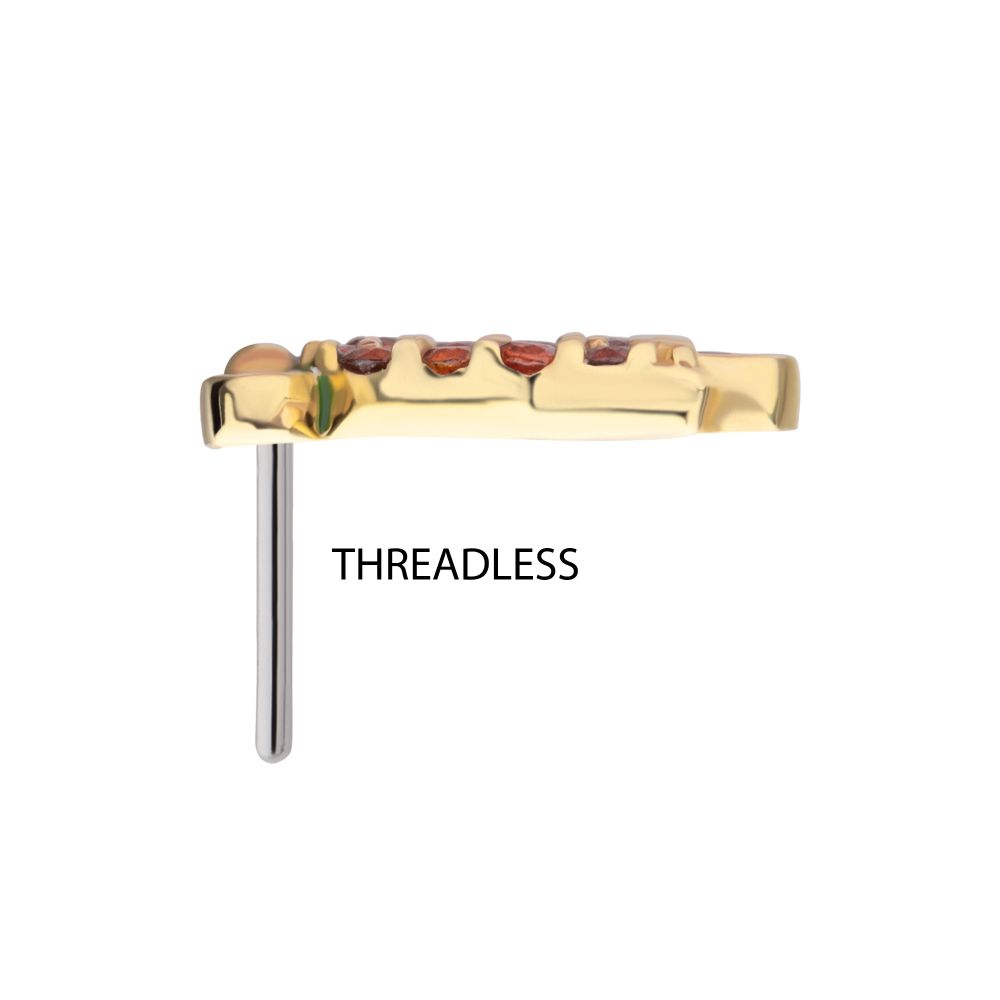 14Kt Yellow Gold Threadless Garnet Gem with Green Enamel Christmas Bell Top. Made of solid 14kt nickel-free Gold with durable 316LVM ASTM F-138 Implant Grade Steel Pin designed to be practical and easy to use. Fits all sizes of pins and bases in our threadless body jewelry line. Pin Size: 0.45mm x 4.7mm.