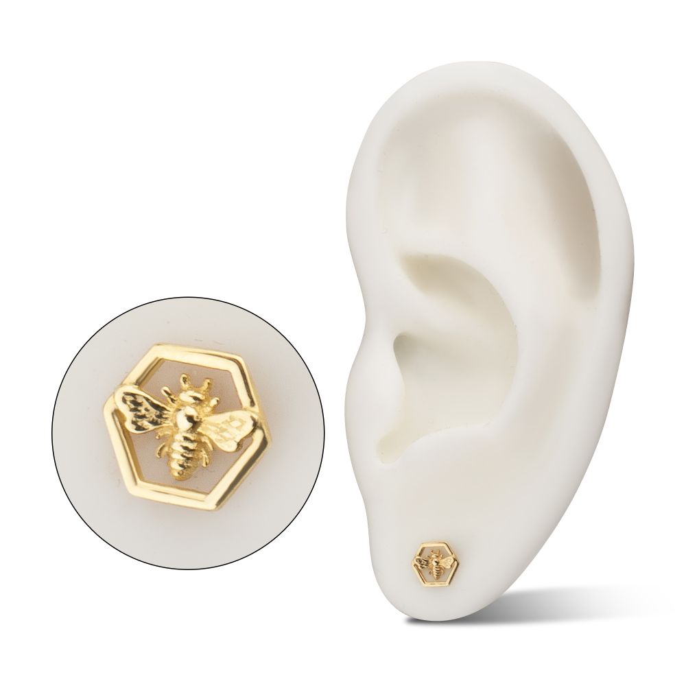 A finely detailed bee framed inside a hexagonal outline. The open design keeps it lightweight and comfortable, while the defined edges and sculptural detail give it dimension. Best suited for conchlobe, helix, or flat piercings, this piece sits flush for everyday wear.