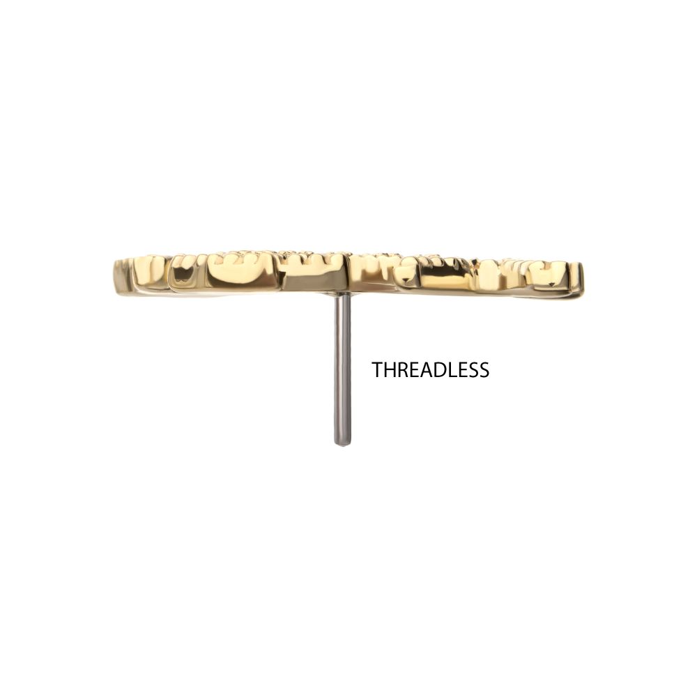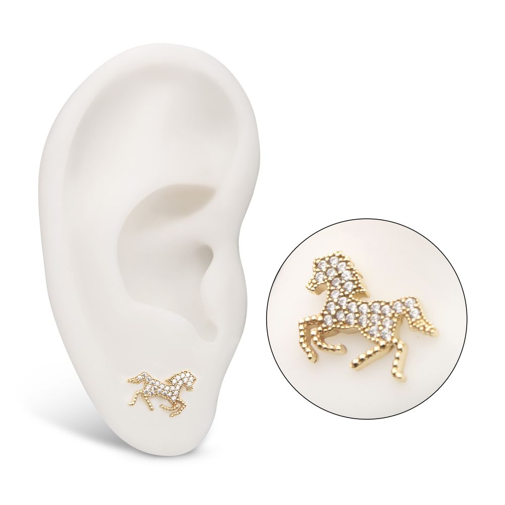 14Kt Yellow Gold Threadless Milgrain Edge Gallopping Horse Top with Pave Gem. Milgrain edge outline gives way to this galloping horse set with pave gems for a wild statement piece. Made of solid 14kt nickel-free Gold with durable 316LVM ASTM F-138 Implant Grade Steel Pin designed to be practical and easy to use. Fits all sizes of pins and bases in our threadless body jewelry line. Pin Size: 0.45mm x 4.7mm.