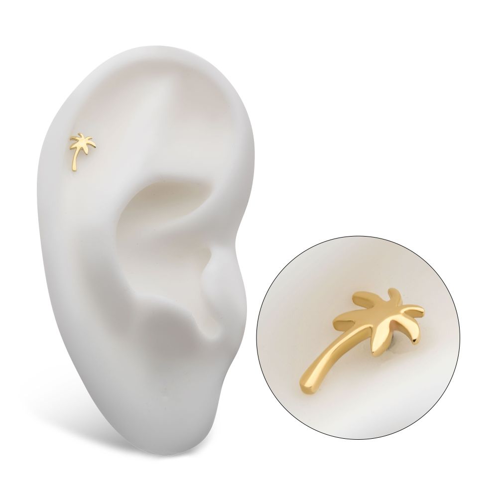 14Kt Yellow Gold Threadless Palm Tree Top is made of solid 14kt nickel-free Gold with durable 316LVM ASTM F-138 Implant Grade Steel Pin designed to be practical and easy to use. Fits all sizes of pins and bases in our threadless body jewelry line. Pin Size: 0.45mm x 4.7mm.