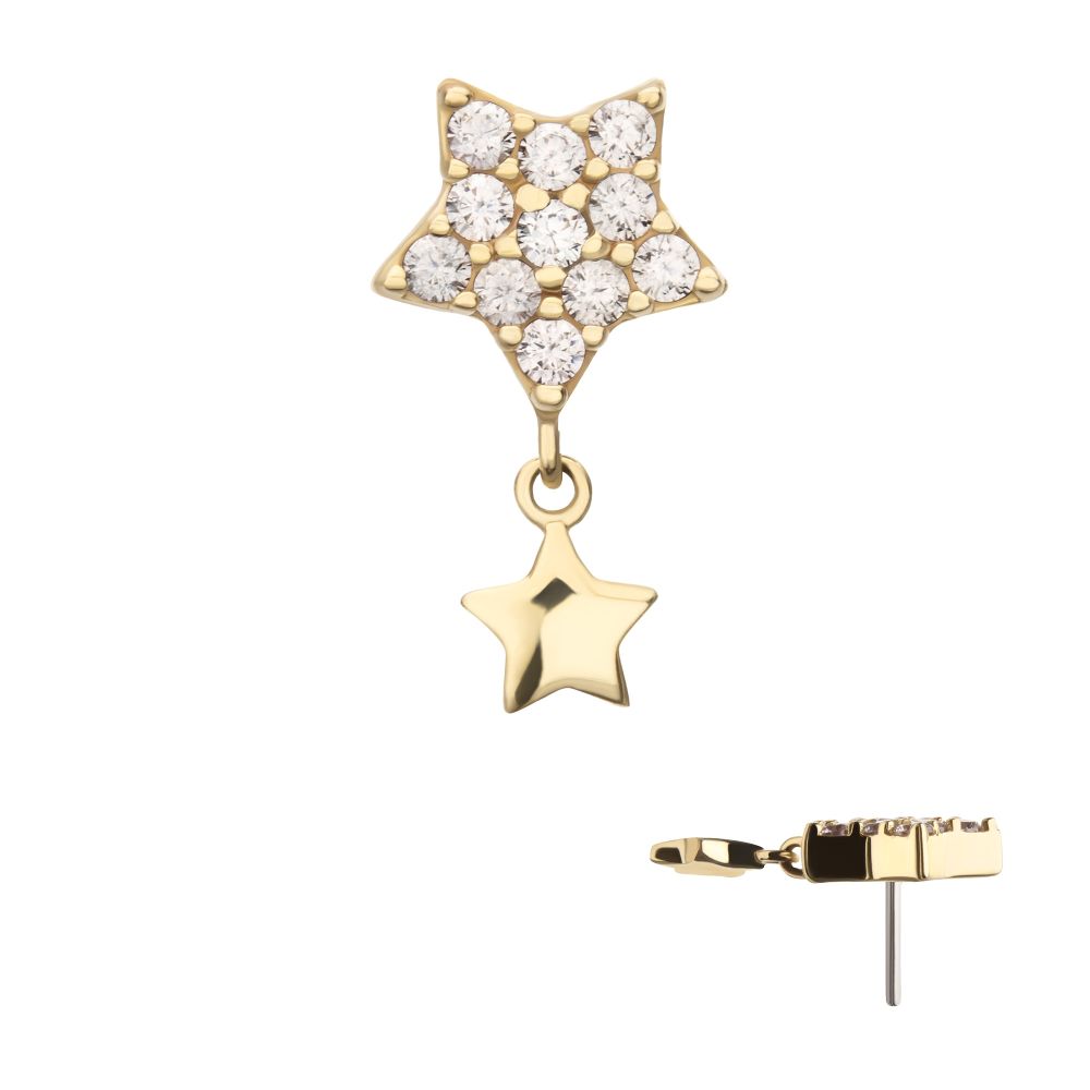 14Kt Yellow Gold Threadless Pave Gem Star Top with Gold Star Dangle. Opposing pave gem star with gold star mini dangle that will compliment piercings. Made of solid 14kt nickel-free Gold with durable 316LVM ASTM F-138 Implant Grade Steel Pin designed to be practical and easy to use. Fits all sizes of pins and bases in our threadless body jewelry line. Pin Size: 0.45mm x 4.7mm.