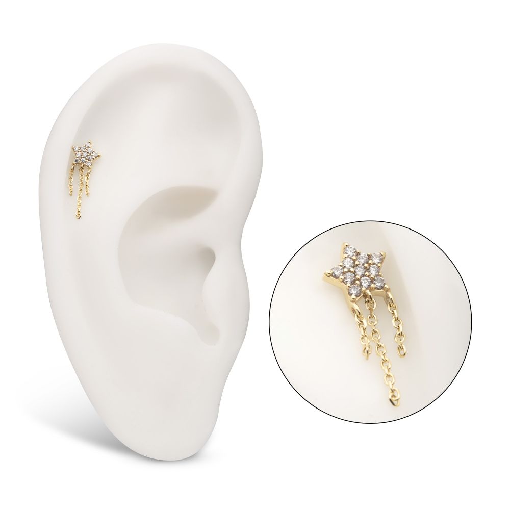 14Kt Yellow Gold Threadless Pave Gem Star Top with Triple Chain Dangle. Pave gem star with 3 tiered dangling chains adds immediate glamour to piercings. Made of solid 14kt nickel-free Gold with durable 316LVM ASTM F-138 Implant Grade Steel Pin designed to be practical and easy to use. Fits all sizes of pins and bases in our threadless body jewelry line. Pin Size: 0.45mm x 4.7mm.