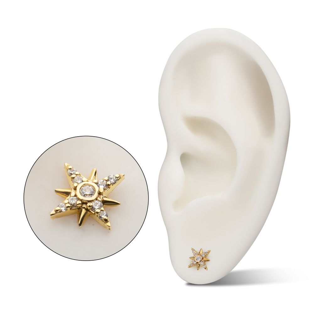Clean geometric lines with a brilliant center gem make this piece sparkle from every angle. The star’s raised profile gives dimension without bulk, making it a striking yet wearable celestial accent with a low profile appeal for versatile placement. Works well in helix, tragus, conch, flat, or lobe piercings — ideal as a focal accent or shimmering accent piece.
