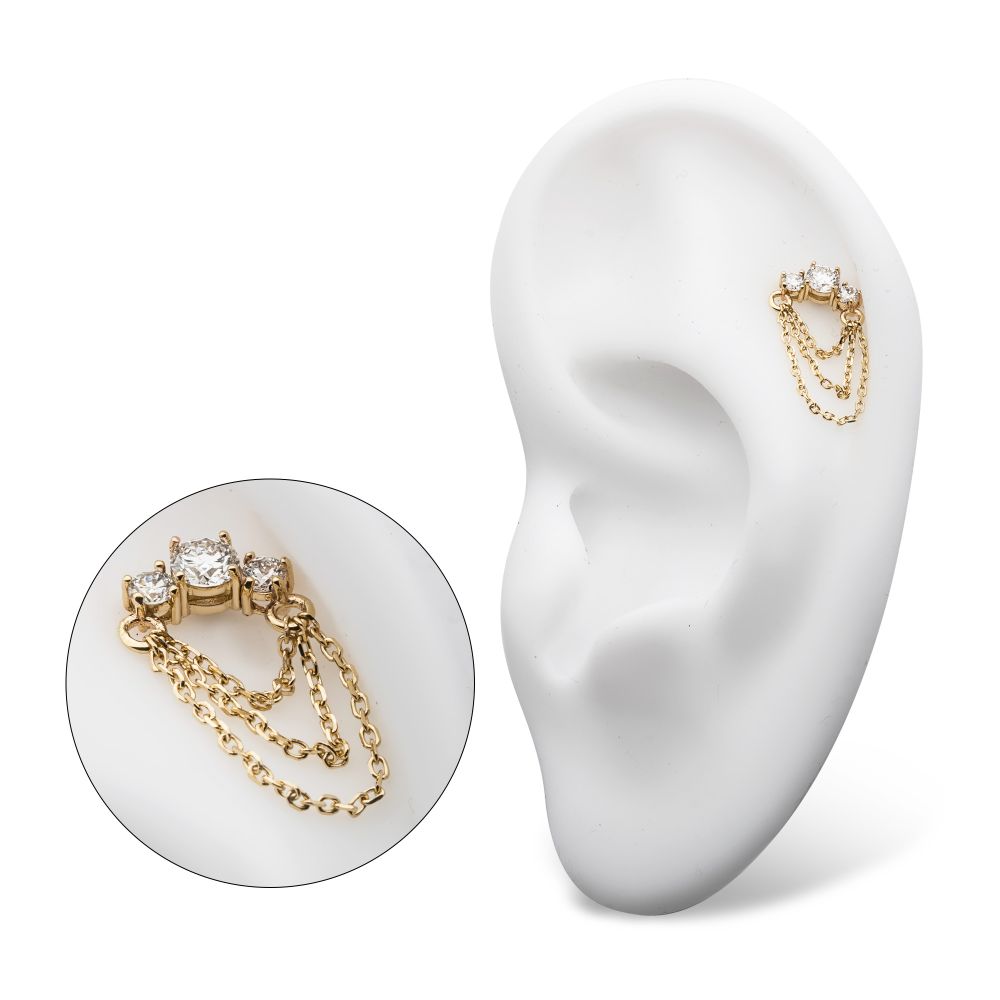 14Kt Yellow Gold Threadless Prong Set 3 Cluster Round Lab-Grown Diamonds Top with Triple Dangle Chain. Made of solid 14kt nickel-free Gold with durable 316LVM ASTM F-138 Implant Grade Steel Pin designed to be practical and easy to use. Fits all sizes of pins and bases in our threadless body jewelry line. Pin Size: 0.45mm x 4.7mm.