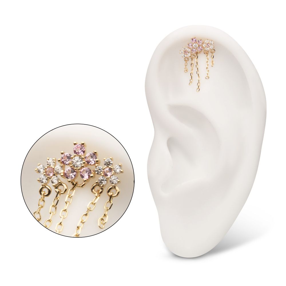 14Kt Yellow Gold Threadless Prong Set Gem Triple Cherry Blossom Flower Top with 5-Chain Dangle. Made of solid 14kt nickel-free Gold with durable 316LVM ASTM F-138 Implant Grade Steel Pin designed to be practical and easy to use. Fits all sizes of pins and bases in our threadless body jewelry line. Pin Size: 0.45mm x 4.7mm.