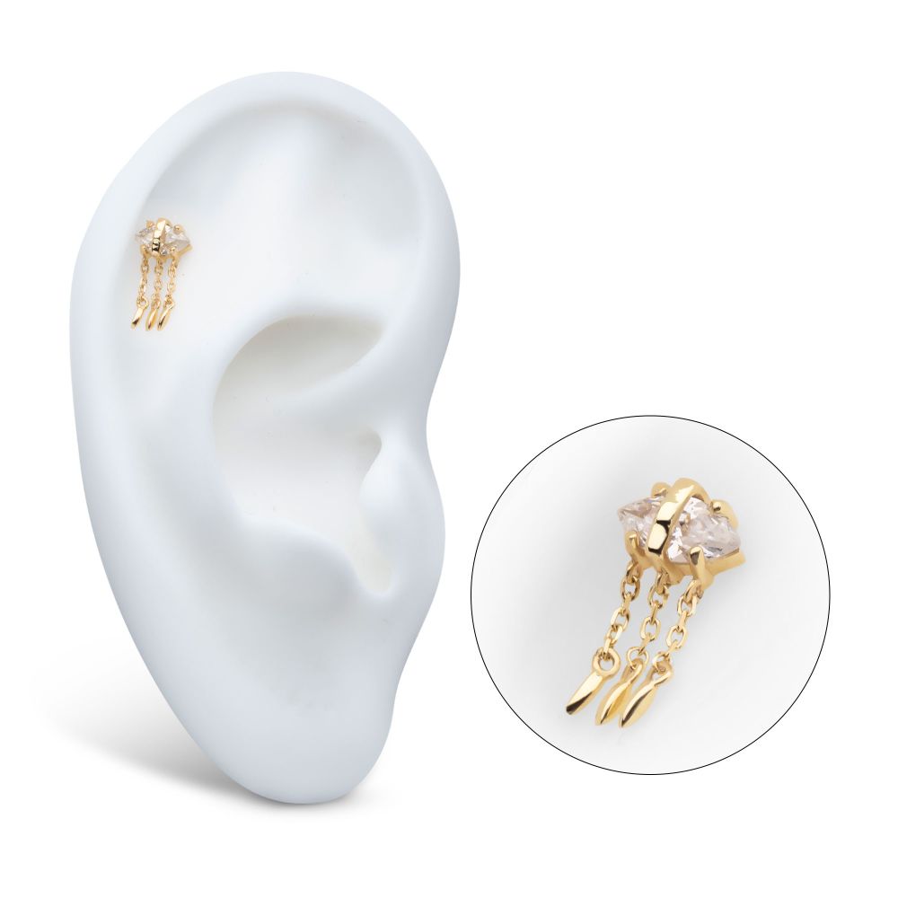 14Kt Yellow Gold Threadless Prong Set Marquise Gem Evil Eye Top with Triple Dangle Chain. Made of solid 14kt nickel-free Gold with durable 316LVM ASTM F-138 Implant Grade Steel Pin designed to be practical and easy to use. Fits all sizes of pins and bases in our threadless body jewelry line. Pin Size: 0.45mm x 4.7mm.