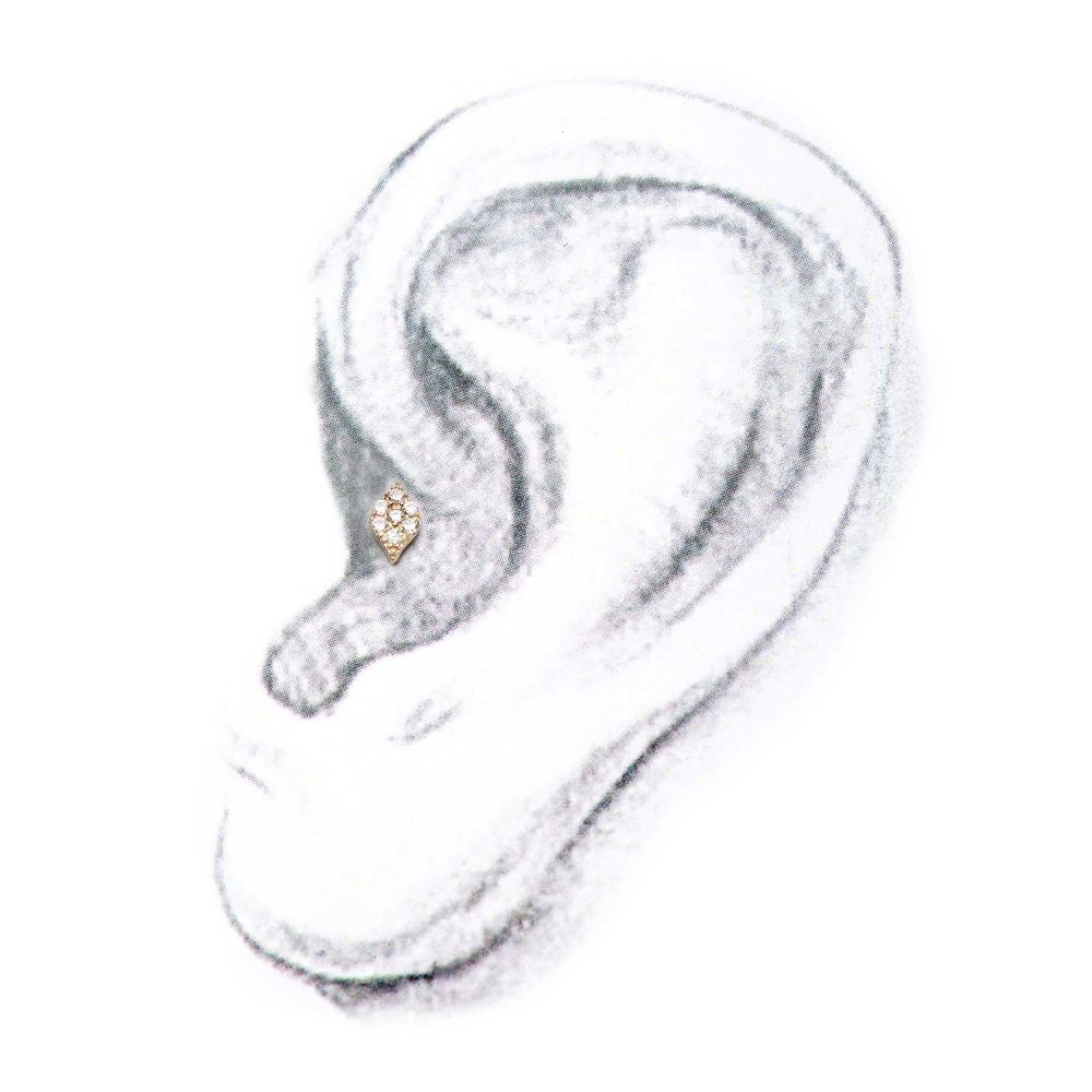 Multiple prong-set cubic zirconia form a Rhombus shape on this threadless 14k gold top for a unique look and a gorgeous top clients will love. Compatible with any threadless Invictus bar or base in any gauge. To secure inside bar or base, add a slight bend to the pin by simply inserting the pin halfway and pushing the top to one side.