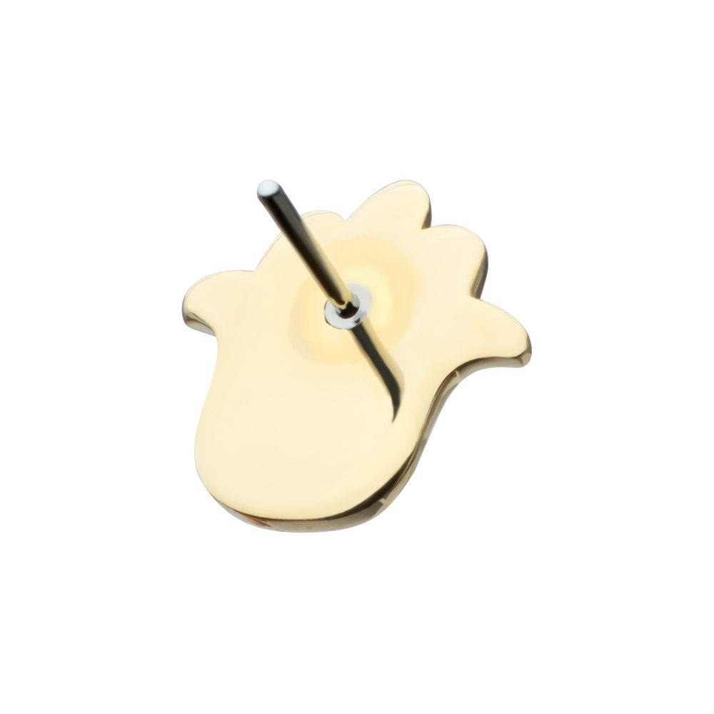 14Kt Yellow Gold Threadless Prong Set Round Blue Opal Hamsa Top. Made of solid 14kt nickel-free Gold with durable 316LVM ASTM F-138 Implant Grade Steel Pin designed to be practical and easy to use. Fits all sizes of pins and bases in our threadless body jewelry line. Pin Size: 0.45mm x 4.7mm.