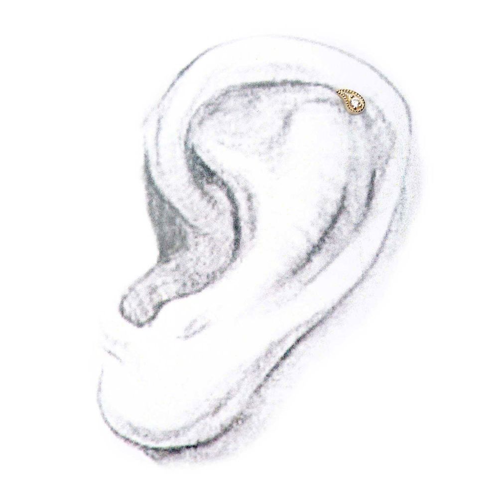 Designed for the left side, a clear cubic zirconia sits in a 14k gold paisley pattern, creating a stunning piece of threadless gold jewelry. Compatible with any threadless Invictus bar or base in any gauge. To secure inside bar or base, add a slight bend to the pin by simply inserting the pin halfway and pushing the top to one side.