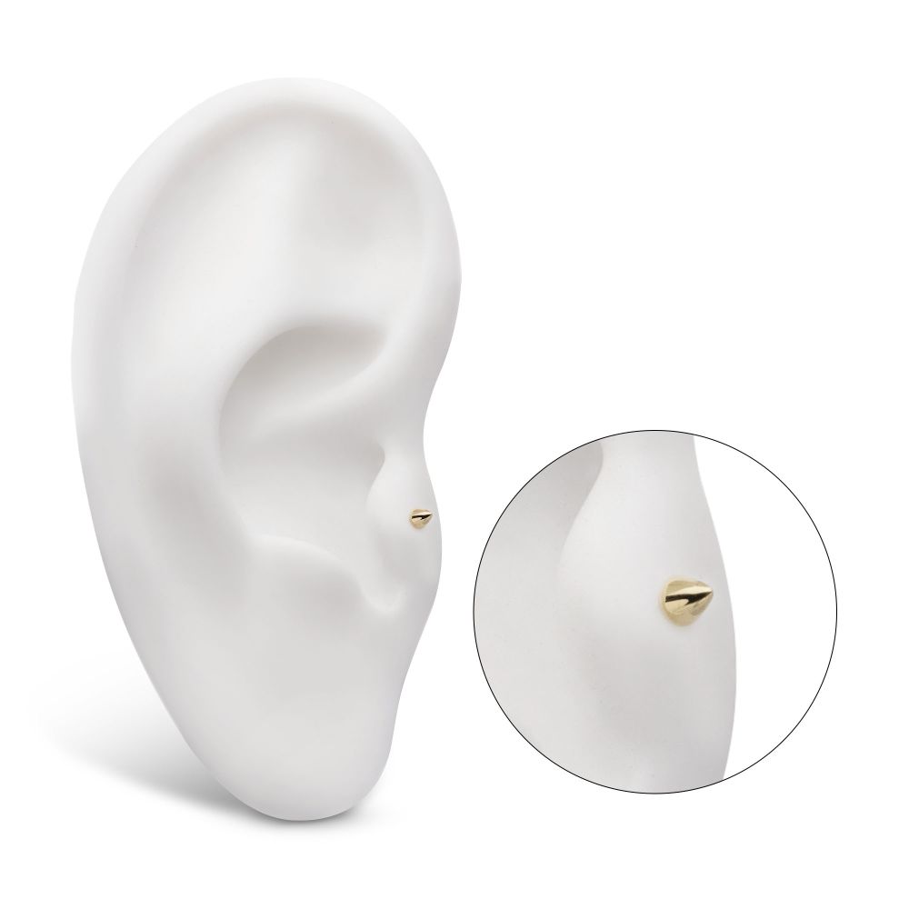 14Kt Yellow Gold Threadless Spike Top. Made of solid 14kt nickel-free Gold with durable 316LVM ASTM F-138 Implant Grade Steel Pin designed to be practical and easy to use. Fits all sizes of pins and bases in our threadless body jewelry line. Pin Size: 0.45mm x 4.7mm