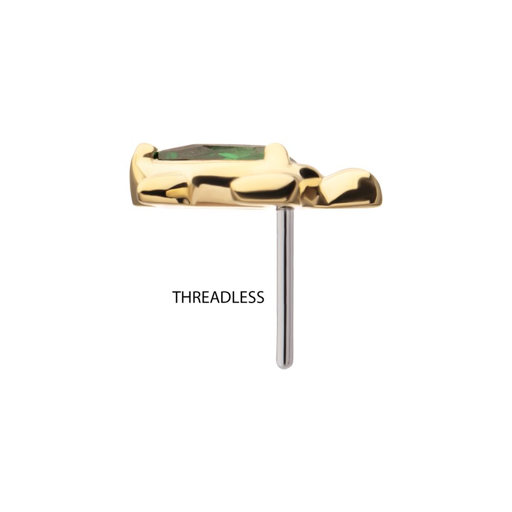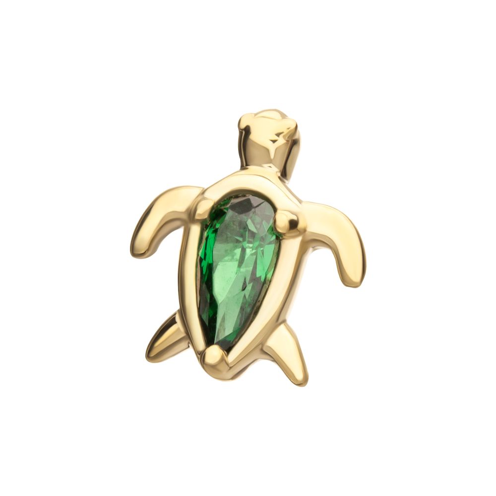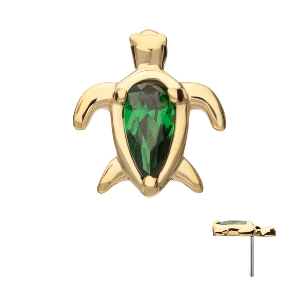 14Kt Yellow Gold Threadless Teardrop Prong Set Gem Turtle Top. Made of solid 14kt nickel-free Gold with durable 316LVM ASTM F-138 Implant Grade Steel Pin designed to be practical and easy to use. Fits all sizes of pins and bases in our threadless body jewelry line. Pin Size: 0.45mm x 4.7mm.
