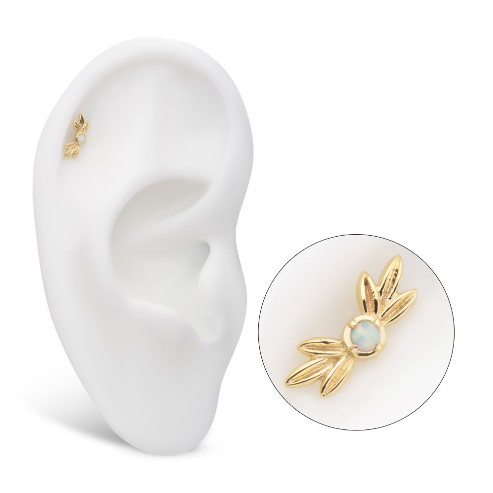 14Kt Yellow Gold Threadless Triple Leaf Edge with Prong Set Round White Opal Top. Made of solid 14kt nickel-free Gold with durable 316LVM ASTM F-138 Implant Grade Steel Pin designed to be practical and easy to use. Fits all sizes of pins and bases in our threadless body jewelry line. Pin Size: 0.45mm x 4.7mm.