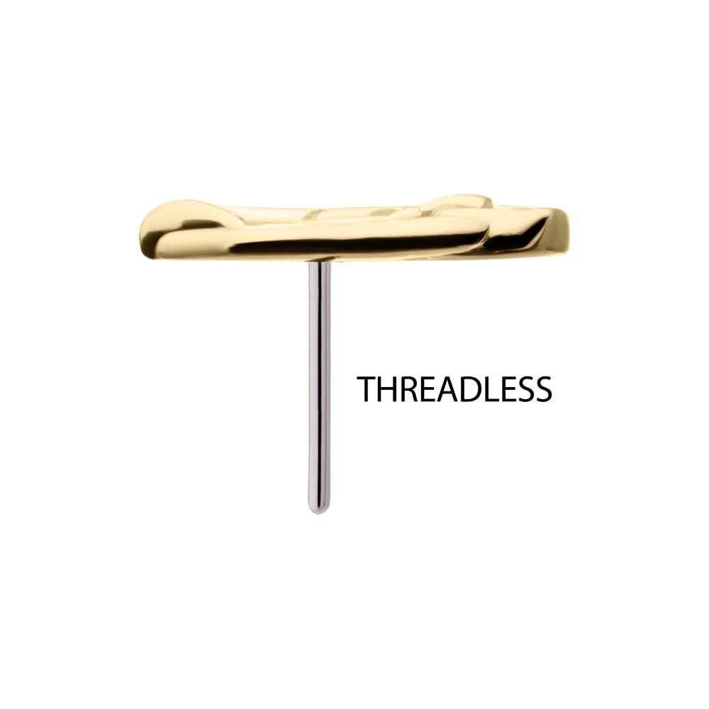 14Kt Yellow Gold Threadless Winged Dragon Top. Made of solid 14kt nickel-free Gold with durable 316LVM ASTM F-138 Implant Grade Steel Pin designed to be practical and easy to use. Fits all sizes of pins and bases in our threadless body jewelry line. Pin Size: 0.45mm x 4.7mm.